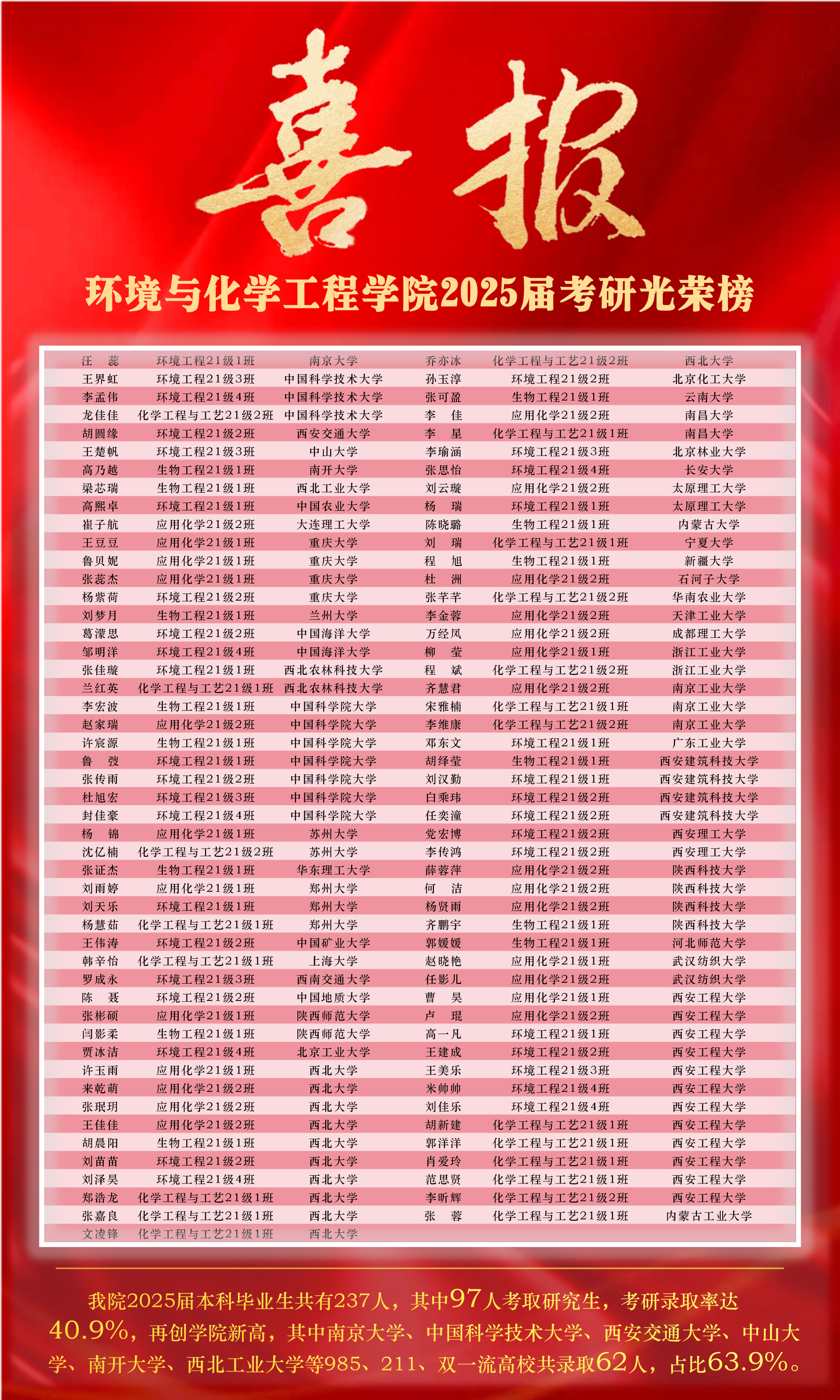 在2025年全国硕士研究生招生考试中,海角网 再传捷报。237名本科毕业生中97人成功“上岸”,整体录取率达40.9%,实现自2018年以来的"七连增",创历史新高。其中62名学子被南京大学、中国科学技术大学等双一流高校及科研院所录取,占比达63.9%。化工2101班、环工2102班、应化2102班升学率超过50%,同时涌现出8个升学率超75%的“学霸宿舍”,其中6#B623、8#A314宿舍全员上岸。这些成绩的取得,既是学院人才培养质量的体现,也是学风建设的成果。