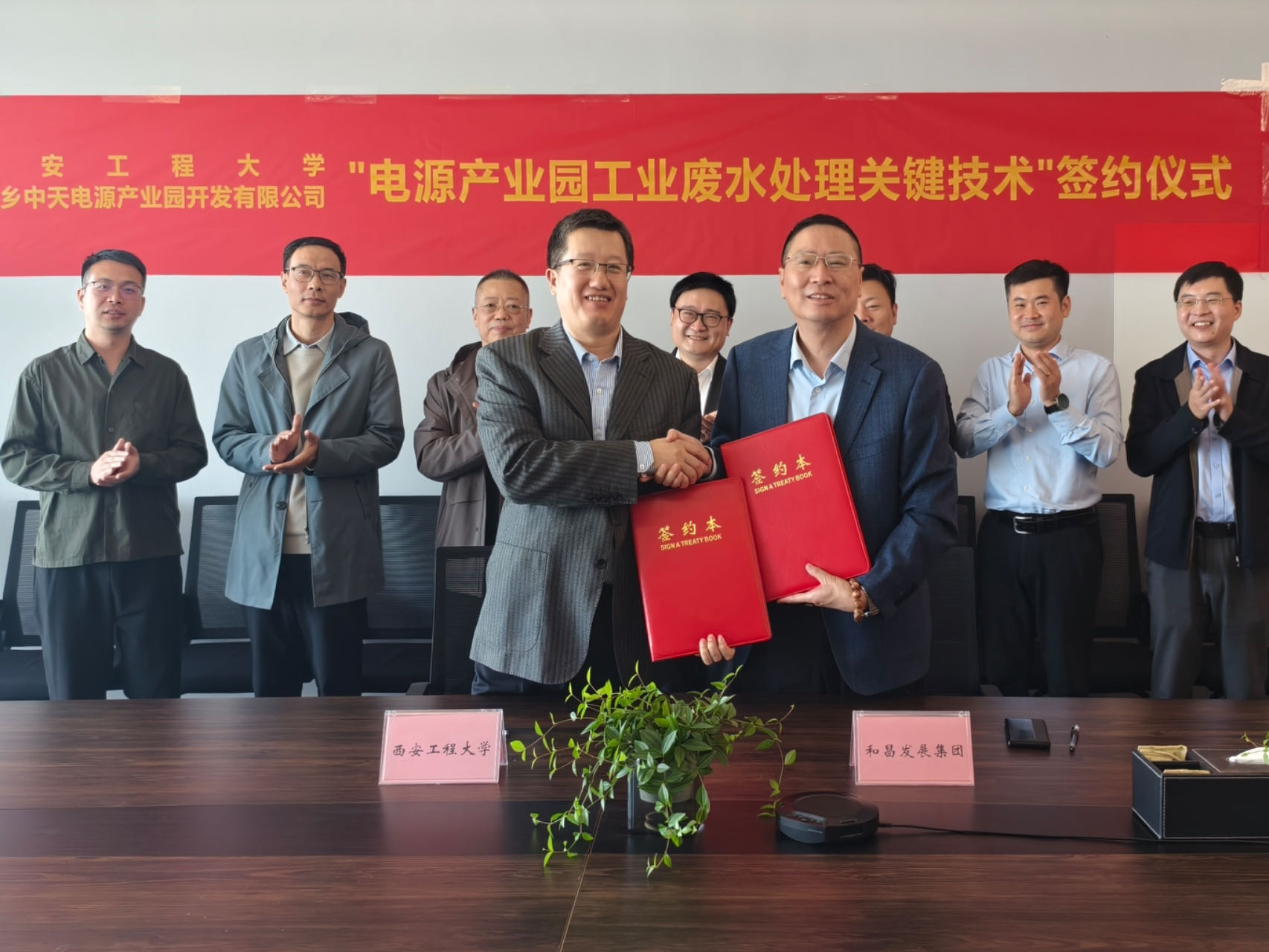 副院长(主持工作)武占省、环境技术研究&应用团队程刚教授、王理明、敖冬等一行前往和昌发展集团参加“电源产业园工业废水处理关键技术”项目签约仪式。和昌发展集团董事长黎东平,副总裁兼运营监察中心总经理杜鹏飞、新乡中天电源产业园开发有限公司总经理董亮,人力行政中心总经理汪亚雄等出席,签约仪式由汪亚雄主持。