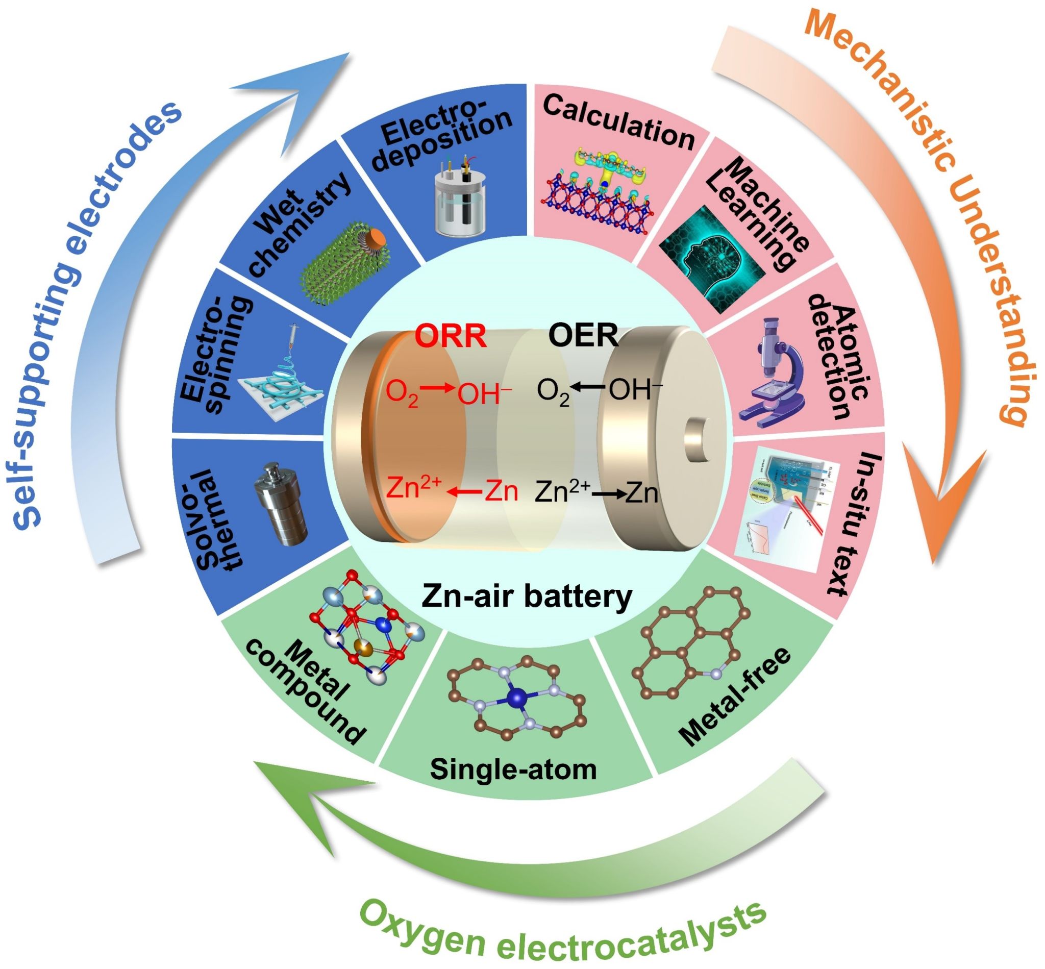 可充电锌-空气电池(ZABs)作为一种结合了二次电池和燃料电池关键特性的新型储能/转换装置,在消费电子市场受到了广泛关注。ZABs不仅理论能量密度高(>1000W h kg-1),它们还显示出其他的特性及优势,例如丰富的资源储量,环境友好无污染,成本低和长时的储存及运行安全性,稳定的充放电性能,电化学响应快和无电池记忆效应等,在电动汽车、固定式储能系统和便携式电子设备等领域展现出巨大的应用潜力。然而,要实现ZABs的商业化和广泛应用,仍需解决一些关键技术难题。