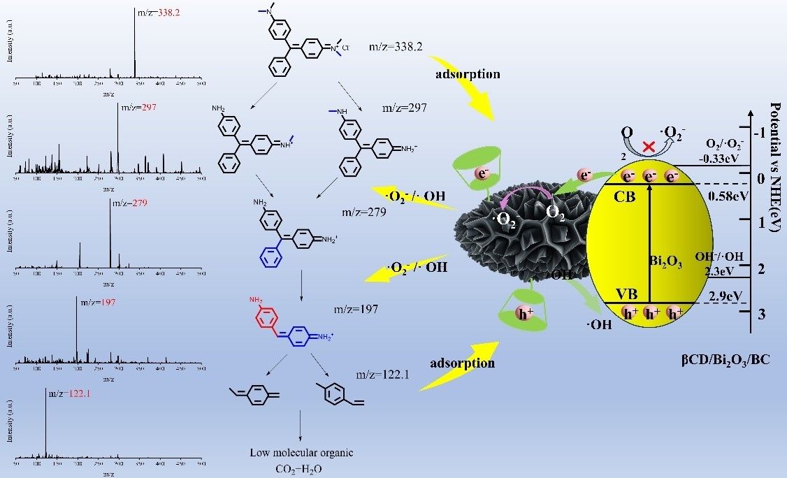 对染料污染物吸附及光催化降解方面,课题组以玉米秸秆生物炭为载体,通过共热解与表面修饰法成功构建了β-环糊精修饰的Bi2O3/生物炭复合材料,β-环糊精通过其疏水空腔增强对污染物的吸附与富集,同时调控界面电荷行为,抑制光生载流子复合,从而协同促进了污染物的表面富集与光催化转化。在可见光下,该材料对孔雀石绿展现出良好的降解效率和循环稳定性。相关研究成果以“β-Cyclodextrin modified Bi2O3/Biochar composite for highly efficient photocatalytic degradation of malachite green”为题,发表于《Applied Surface Science》(中科院SCI二区)。论文第一作者为海角网