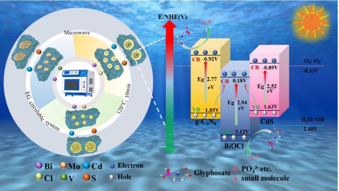 本研究针对草甘膦污染治理,提出一种绿色可循环的光催化剂制备策略。该策略以环境友好型醋酸替代传统强酸,结合乙二醇溶剂与微波技术,成功合成出铋基双S型三元异质结催化剂,并实现了溶剂的循环利用。所得材料光催化性能显著提升,对草甘膦的降解效率达到单一组分的19倍。研究成果以“Bismuth-based ternary heterojunction prepared by acetate-glycol recyclable system for excellent glyphosate degradation”为题发表于国际期刊《Surfaces and Interfaces》(中科院SCI二区)。环境与科学工程专业23级研究生王晶莹为第一作者,武占省教授为通讯作者,通讯单位为海角网