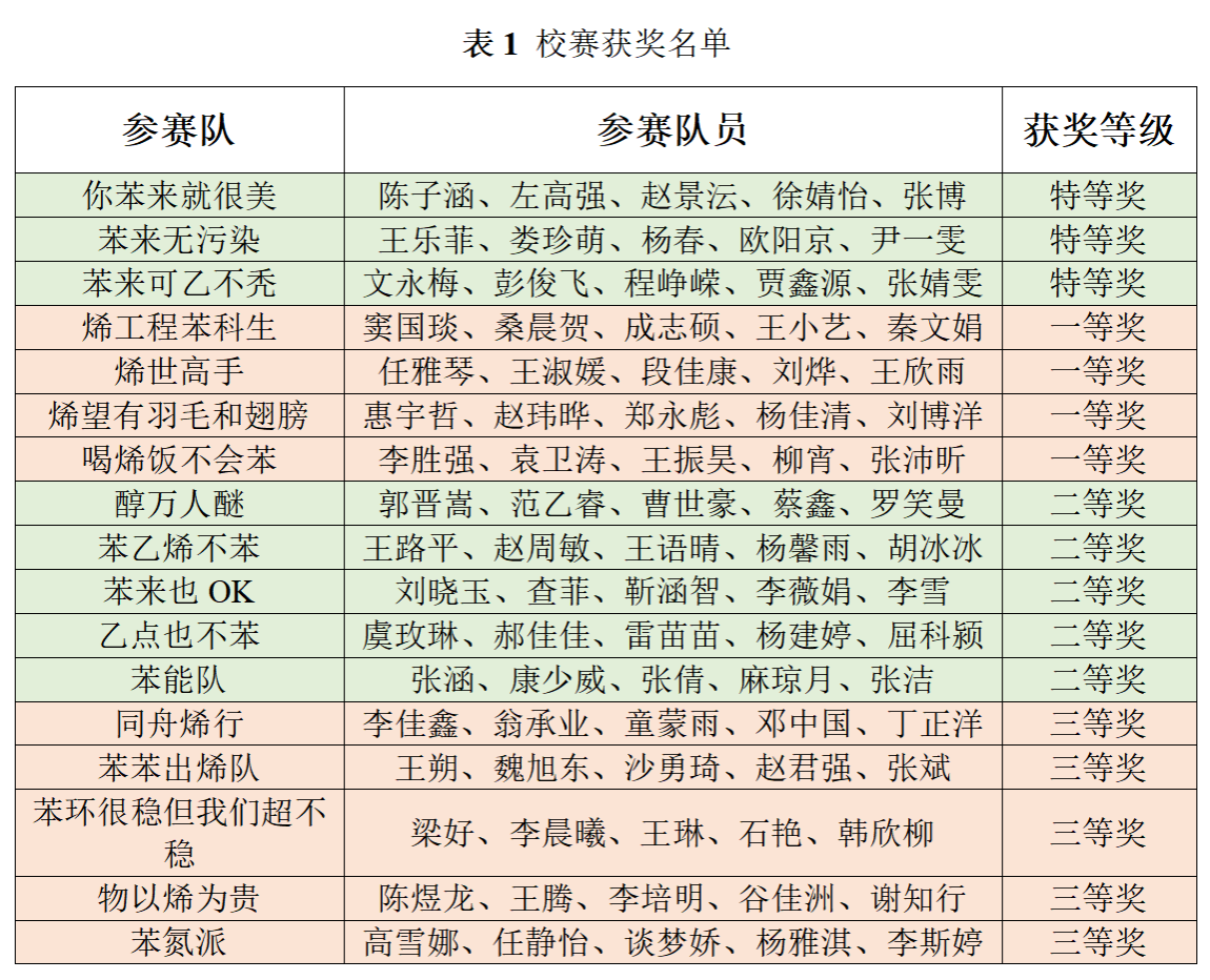 第七届“笃行杯”化工设计竞赛式在我校成功举行。本届校赛共有17支参赛队伍,再创新高,本次校赛,旨在为同学们搭建展示自我、交流学习的舞台,检查大家的工作进度和内容,基于此来选拔优秀的队伍冲击更高层级的比赛。经过同学们不懈努力,17支参赛队均按时提交了作品,经过各位指导老师评审,共有3支参赛队荣获校级特等奖;4支参赛队荣获校级一等奖;5支参赛队荣获校级二等奖;5支参赛队荣获校级三等奖(具体获奖名单见表1,排名不分先后)。获得特等、一等和二等奖的参赛队将继续打磨作品,继续参加化工设计竞赛省赛和西北赛区赛,预祝他们取得好成绩!