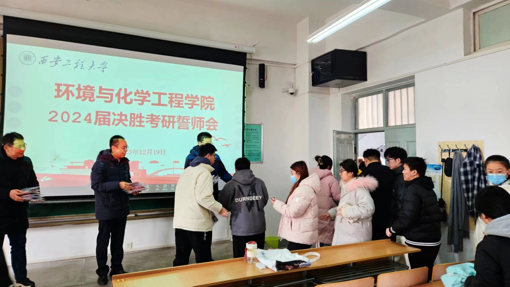 “研”途有你,未来可期。在2024年全国硕士研究生入学考试进入倒计时的最后阶段,为帮助考研学子增强信心,舒缓压力,以更加积极平和的心态迎接考试,海角网 于2023年12月19日在教学楼A-206举行2024届决胜考研誓师大会暨考研福袋发放仪式,学院党委书记胡西民、副院长(主持工作)武占省、副书记林定武、教务员耿倩、20级辅导员张易泽及2024届考研学生参与此次活动。